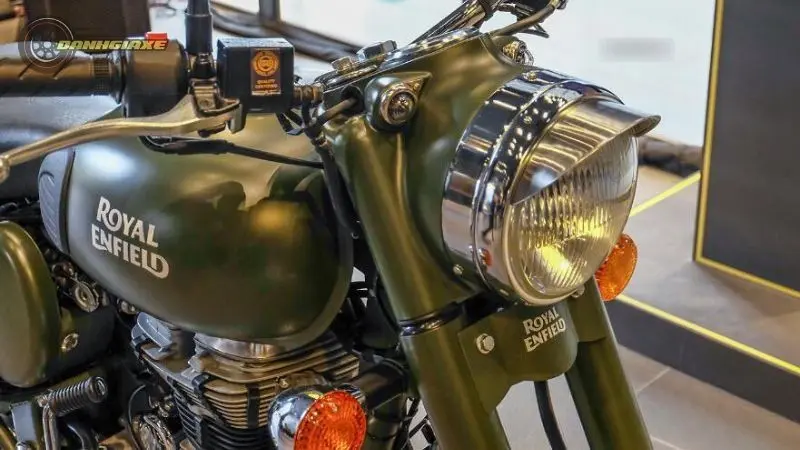 Những chi tiết này không chỉ làm nổi bật thêm sự đẳng cấp của chiếc xe mà còn giúp tôn lên vẻ đẹp cổ điển và sự tinh tế của thương hiệu Royal Enfield.Thiết kế đầu đèn với miếng kim loại phía trên, trông như vành nón, là đặc trưng rất riêng của các mẫu xe của Royal Enfield.