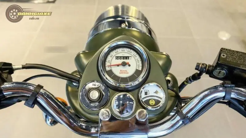 Đồng hồ tốc độ và đồng hồ báo xăng trên Royal Enfield Classic 500 được “hôn phối” một cách tinh tế, nằm phía trên đèn pha, tạo nên một điểm nhấn đặc biệt và cuốn hút.