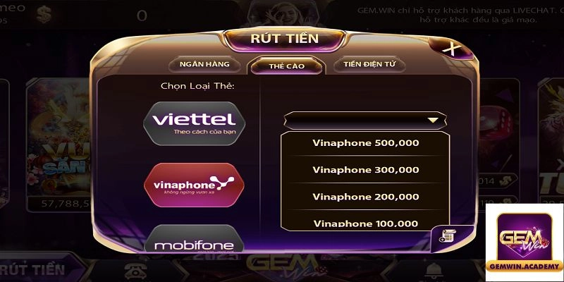 Cách rút tiền Gemwin qua thẻ cào di động