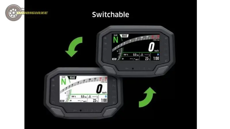 Một trong những điểm nổi bật của phiên bản mới của Kawasaki Ninja ZX-10R chính là khả năng hiển thị được cải thiện đáng kể. Bảng đồng hồ điện tử mới không chỉ mang lại giao diện hiện đại và trực quan hơn, mà còn giúp người lái dễ dàng theo dõi các thông số quan trọng như tốc độ, vòng tua máy, và mức nhiên liệu.