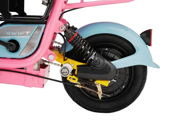 Vành chiếc Swift 3 yên nhỏ gọn với đường kính 12 inch, kết hợp lốp không săm và phanh đĩa phía trước cùng phanh cơ phía sau, đảm bảo an toàn cho người lái trong mọi điều kiện đường xá.